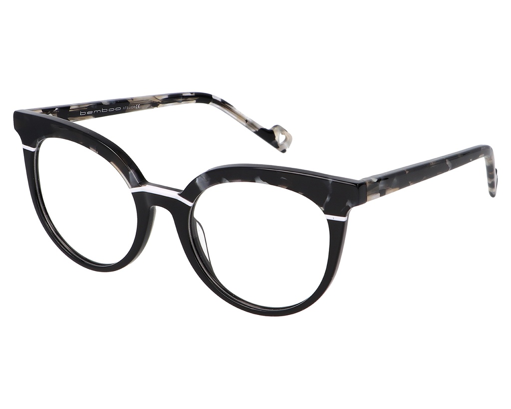 Montura redonda de acetato negra con detalles en la parte superior separados por una línea blanca. Nueva colección 2023